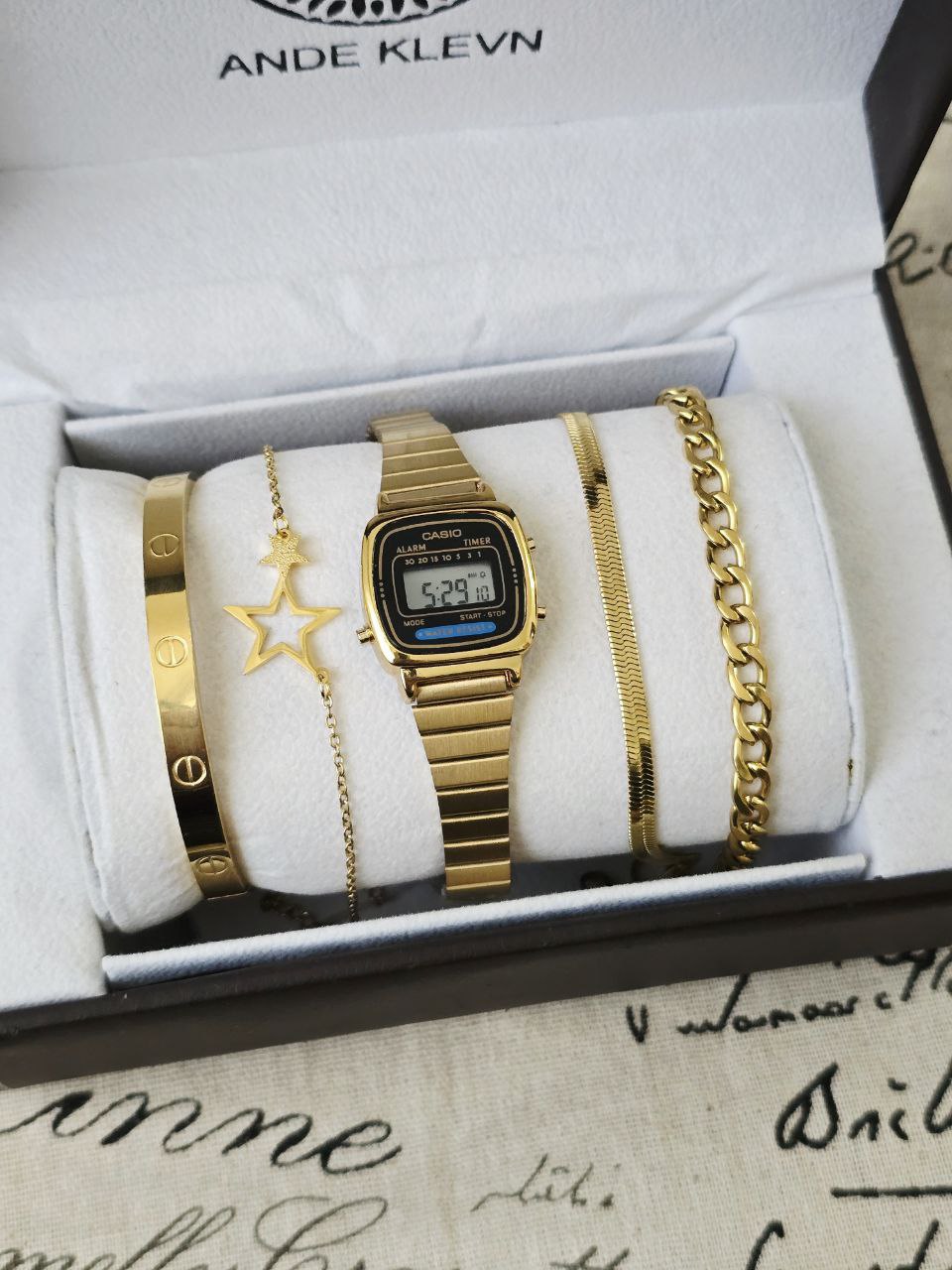 ست ساعت زنانه و مردانه برند کاسیو و دو عدد دستبند کارتیر استیل و دو تا انگشتر