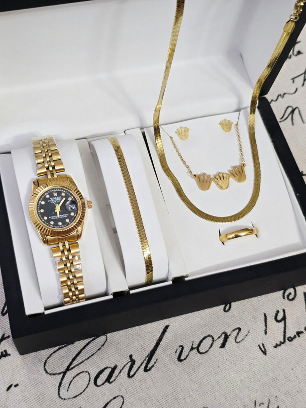 ست زنانه و دخترانه ساعت رولکس تقویم دار   و دستبند و نیمست استیل  و حلقه بهمراه جعبه کادویی و باتری یدکی