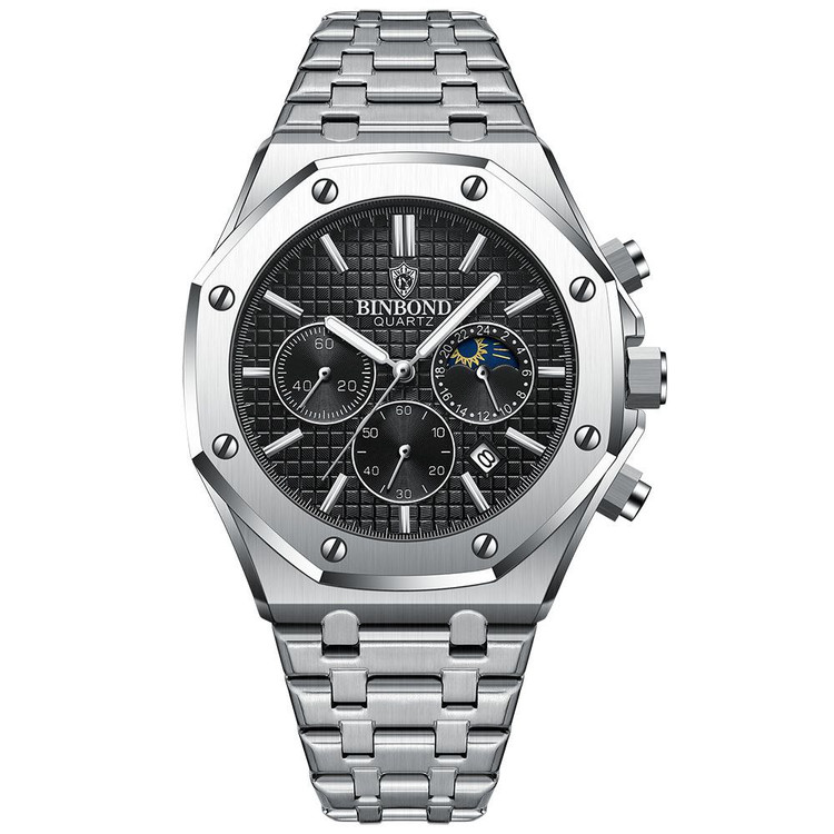 ساعت مردانه بین باند مدلی نو اوریجینال شرکتی •مدل B3459 نمایش سان موون دارای روزشمار کرنوگراف مقاوم دربرابر آب بند استیل قاب استیل(روکش متال) شیشه کریستال دارای نمایشگر ۲۴ ساعت قفل استیل پروانه ای موتور کوارتز سه موتور فعال صفحه شب نما خاص وجذاب