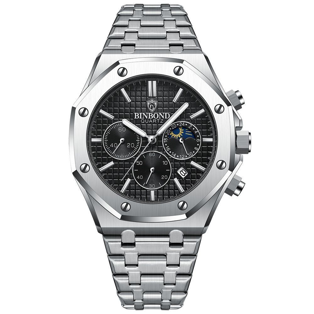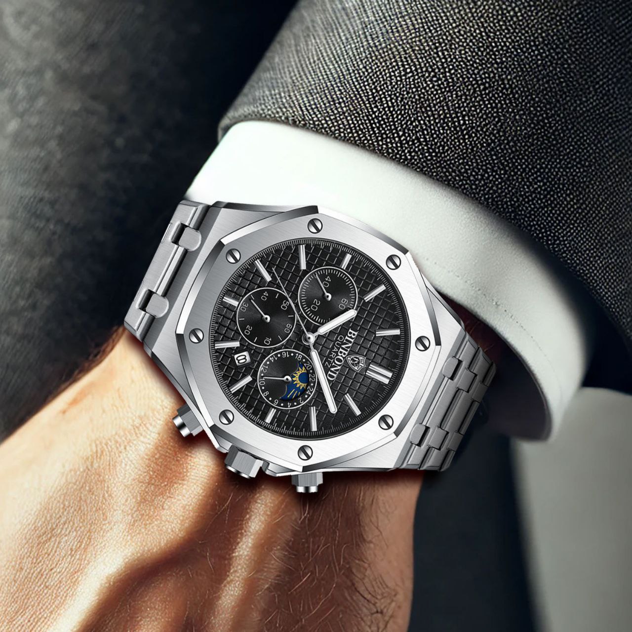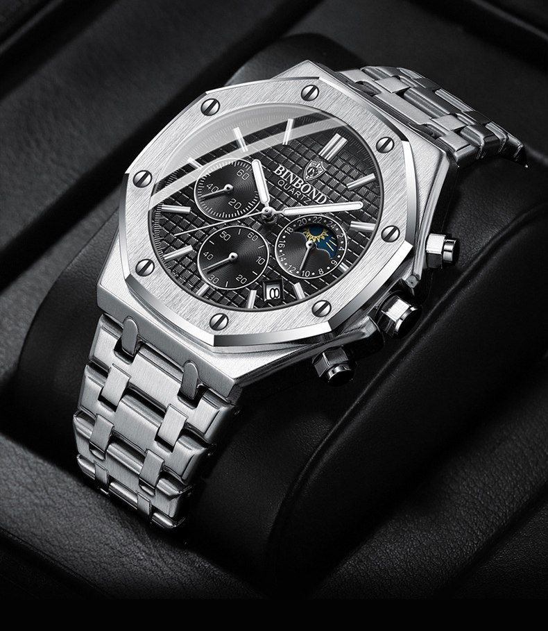 ساعت مردانه بین باند مدلی نو اوریجینال شرکتی •مدل B3459 نمایش سان موون دارای روزشمار کرنوگراف مقاوم دربرابر آب بند استیل قاب استیل(روکش متال) شیشه کریستال دارای نمایشگر ۲۴ ساعت قفل استیل پروانه ای موتور کوارتز سه موتور فعال صفحه شب نما خاص وجذاب