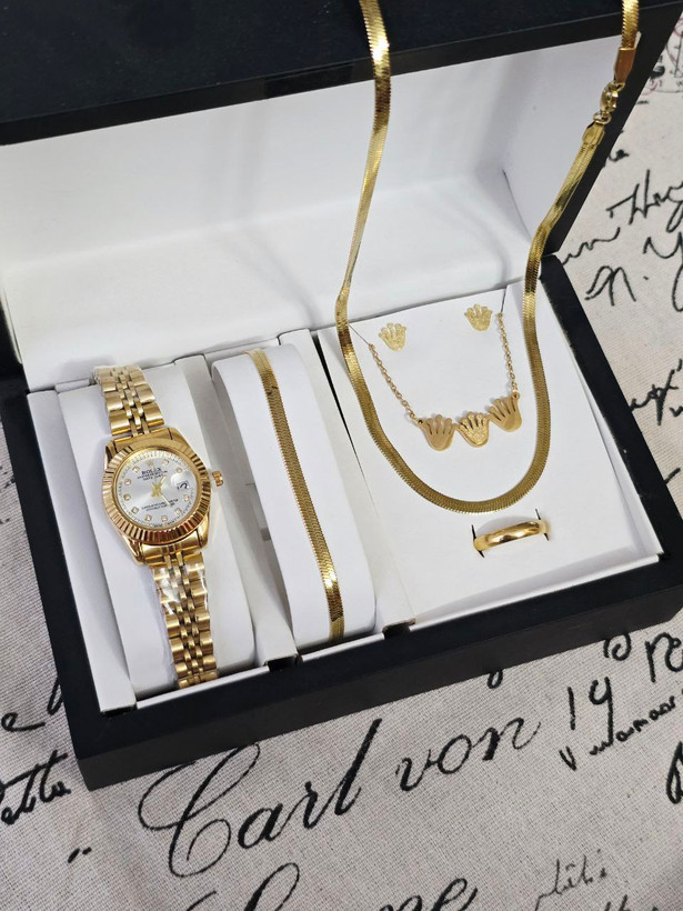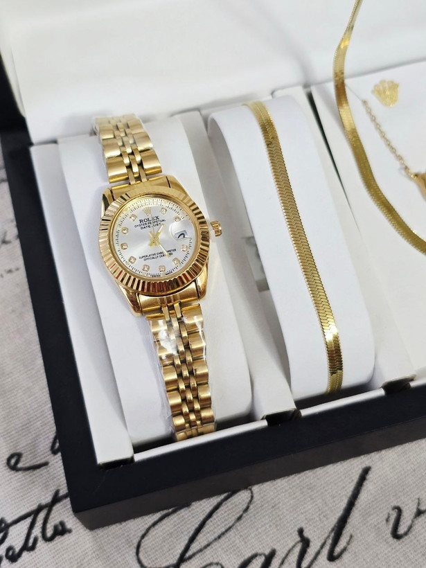 مشخصات محصول :ست زنانه و دخترانه ساعت رولکس تقویم دار و دستبند و نیمست استیل و حلقه بهمراه جعبه کادویی و باتری یدکی