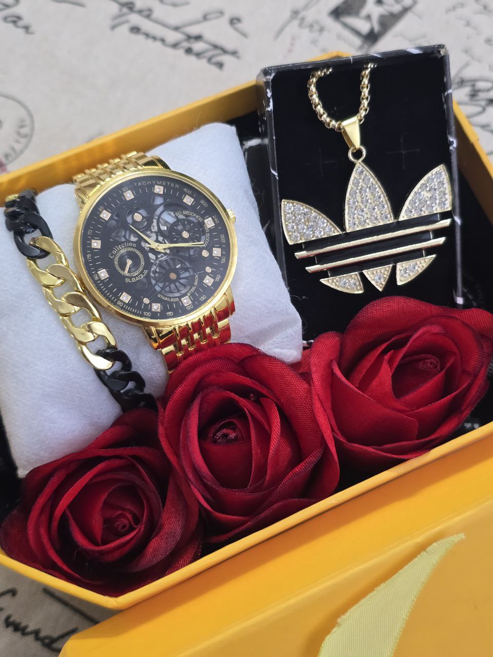 پک مردانه ساعت  و دستبند و گردنبند بهمراه باکس و گل مصنوعی