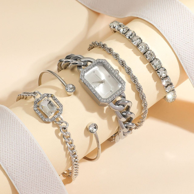 ♤ست کامل ۵تیکه کارتیه قاب دورنگین شیشه الماسی موتور کوارتز قفل دستبندی