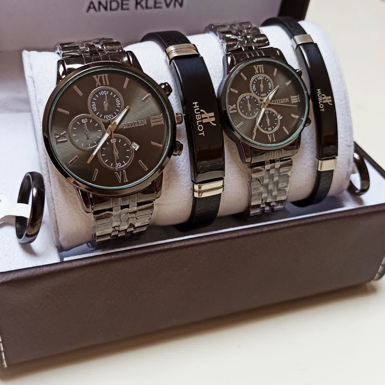 ست ساعت زنانه و مردانه سیتیزن ساعت ها دارای روزشمار دو عدد دستبند چرمی و دو تا حلقه