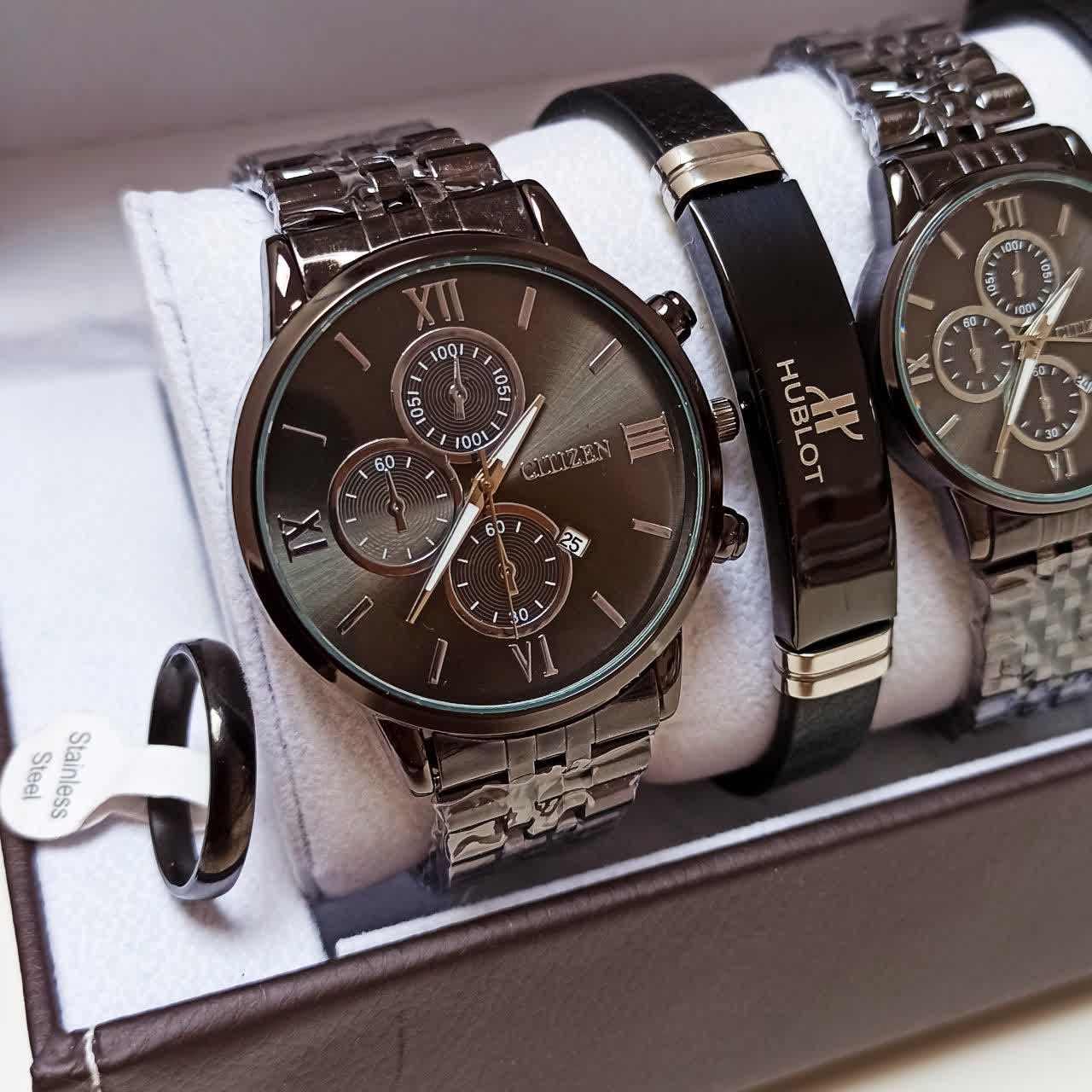 ست ساعت زنانه و مردانه سیتیزن ساعت ها دارای روزشمار دو عدد دستبند چرمی و دو تا حلقه