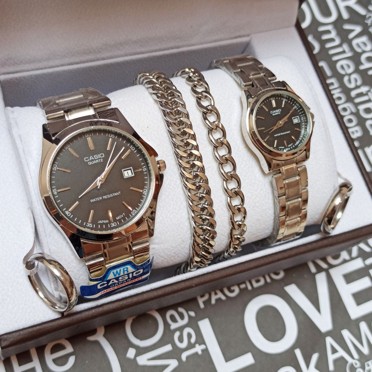 ست ساعت زنانه و مردانه برند کاسیو و دو عدد دستبند کارتیر استیل و دو تا انگشتر