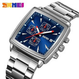 Skmei For men ساعت مردانه سه موتوره فعال برند اسکمی قطر ۴۰ میلی متر رنگ ثابت ضدآب قاب استیل بند استیل شیشه ضدخش روز شمار دارد ضدآب 3ATM باکس مخمل