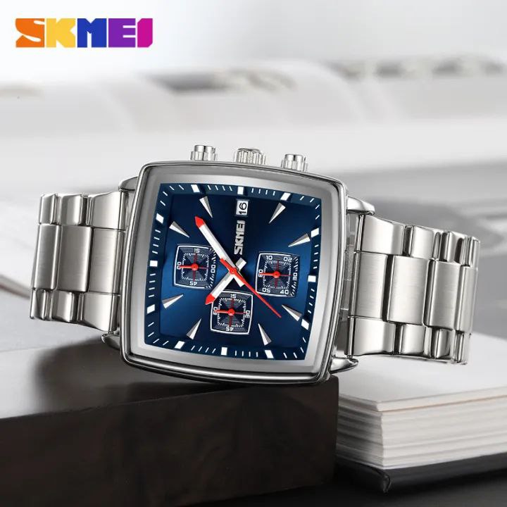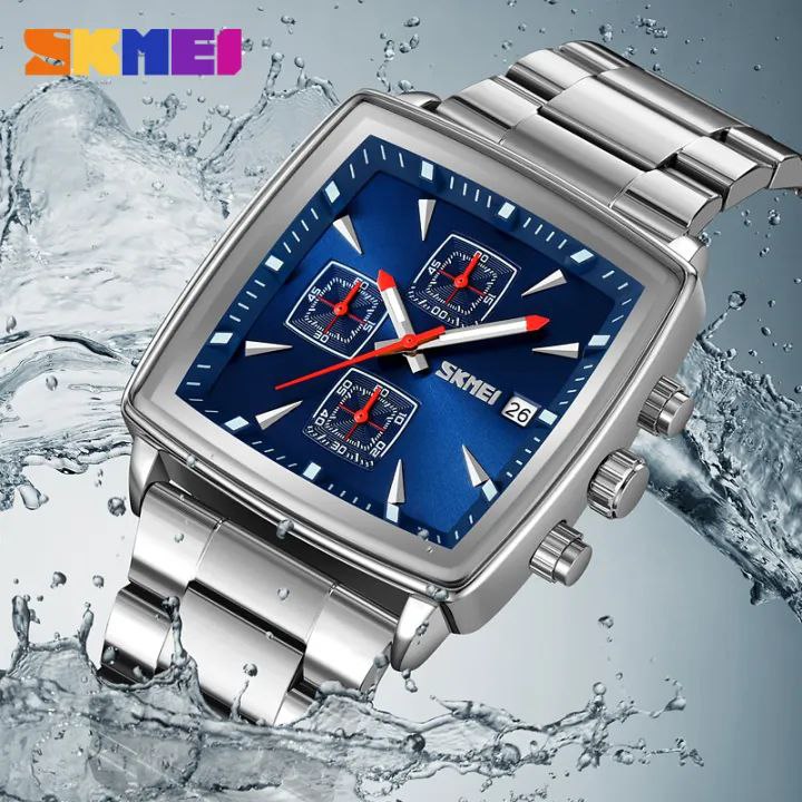 Skmei For men ساعت مردانه سه موتوره فعال برند اسکمی قطر ۴۰ میلی متر رنگ ثابت ضدآب قاب استیل بند استیل شیشه ضدخش روز شمار دارد ضدآب 3ATM باکس مخمل