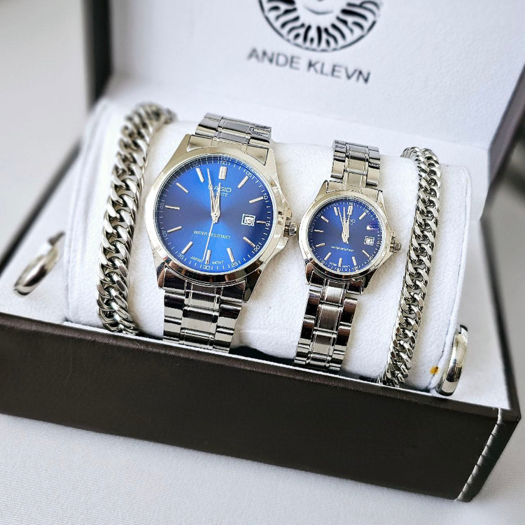 ست ساعت زنانه و مردانه برند کاسیو دو عدد دستبند کارتیر استیل و دو تا انگشتر