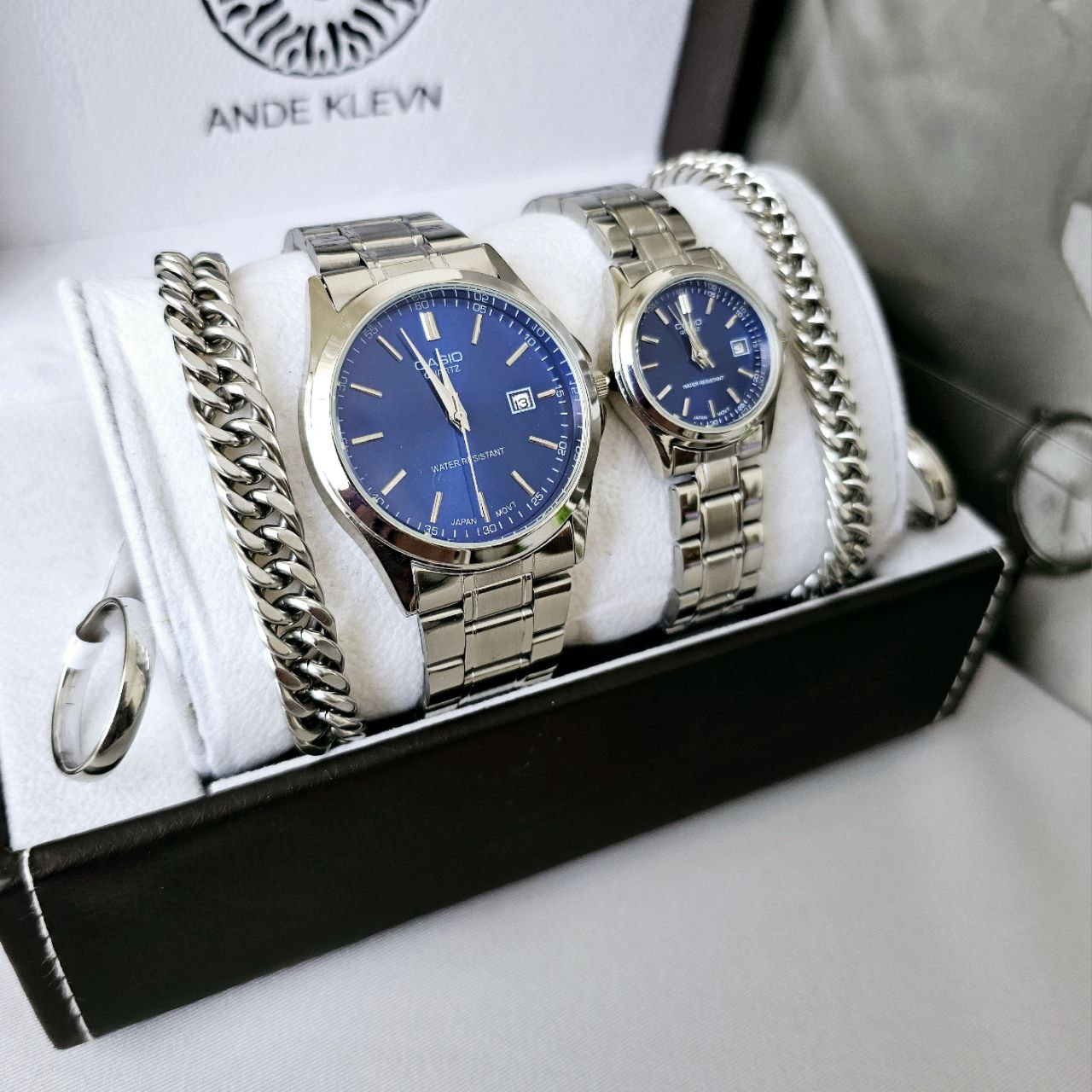 ست ساعت زنانه و مردانه برند کاسیو دو عدد دستبند کارتیر استیل و دو تا انگشتر