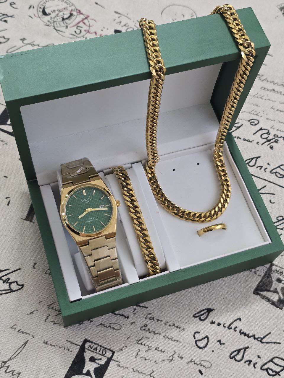 ست مردانه ساعت تیسوت و دستبند و گردنبند زنجیر استیل و حلقه استیل( سایز ۶ تا ۱۰) بهمراه جعبه کادویی و باتری یدکی